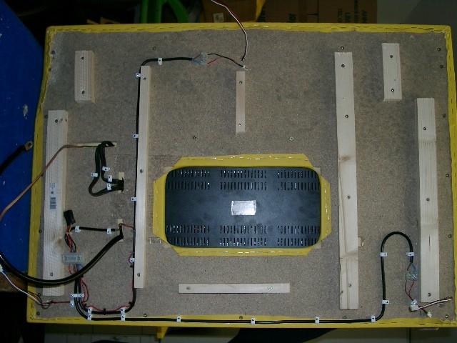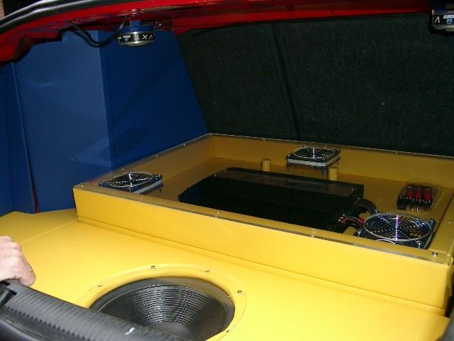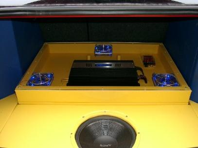Unten erkennt man wie ein nicht Fachmann die Leitungen verlegt hat, war mein erstes mal. Dieser kleine schwarze Kasten ist ein Relais was die Remotesteuerung des Radio´s nicht zerstören soll. Ich hoffe man sieht es. Das Ausgehschnitte Viereck unter der Endstufe soll die Warme Luft entweichen, aber das machen schon die 3 PC Lüfter ganz gut :)