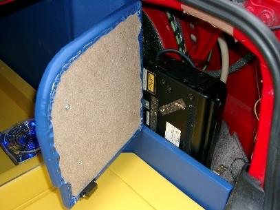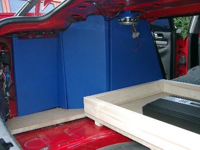 Links unten: zeigt die fertige rechte Seite des Ausbaues, hinter der Tür ist der CD-Wechsler versteckt.Der mittlerweile ersetzt worden ist durch einen MP3 Radio