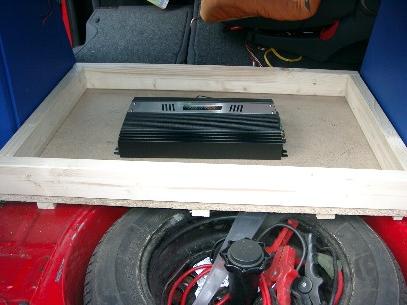 Aber dann hätte man die Sportkarre nicht mehr rein bekommen.Also haben wir den Bass ganz normal nach unten gelegt, vor der Kiste. Wie man das jetzt auf dem Bild sehe kann.